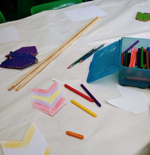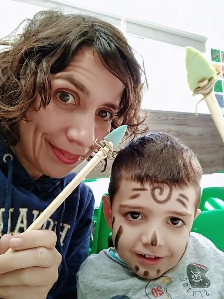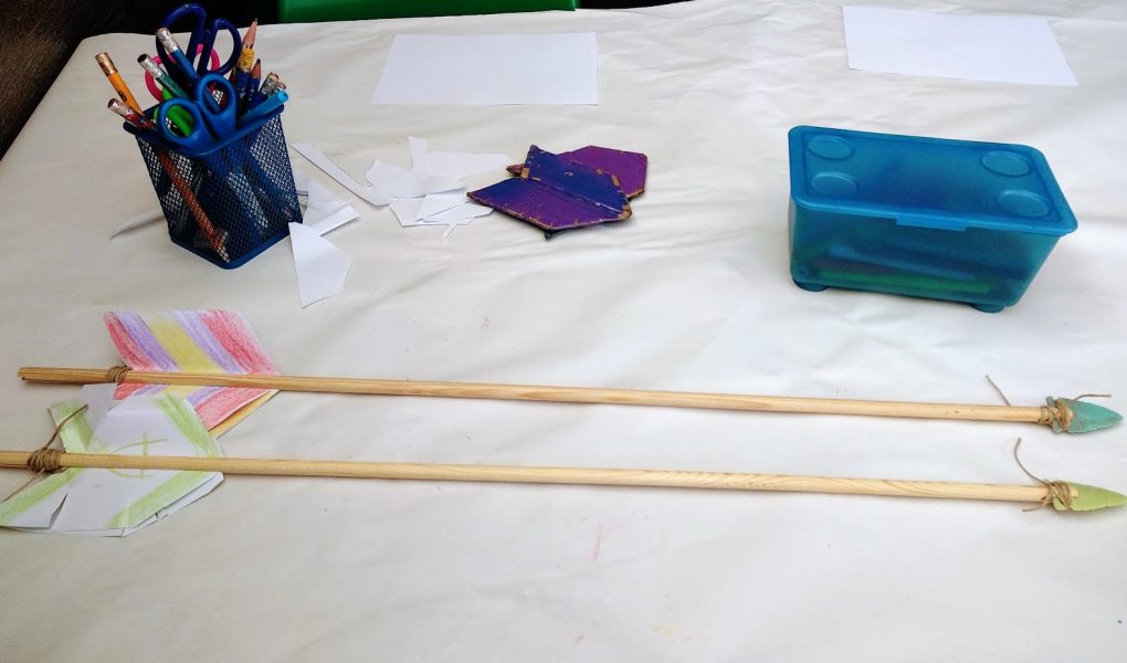 - El segundo taller es llamado de Paleotrueque. Una iniciativa genial en la cual se colabora con Cruz Roja Española. En vez de abonar el precio del taller, se aporta un donativo en forma de comida, artículo de aseo o juguete. Cada fin de semana se solicita una cosa y es una forma de colaborar y enseñar a los más pequeños un poco de solidaridad. También varían cada semana y nosotros tuvimos la suerte que nos tocó el de flechas. Aquí nos veis todo orgullosos con nuestras obras de arte.