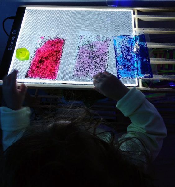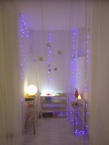 Además de todos los elementos para jugar, La Sala de Psico cuenta con un rinconcito sensorial. Al principio estaban todos como locos por botar, rebotar y hacer el «brutote». Pero antes o después casi todos pasaron por este rincón a experimentar. Mesas de luz, frascos de la calma, diferentes texturas con las que experimentar… Un lugar tranquilo para experimentar un montón de sensaciones.