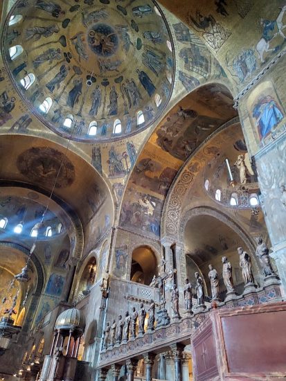 Es la joya de la ciudad y como tal en la que más gente vas a encontrar. Su mezcla de estilos bizantinos, góticos e islámicos refleja lo que fue Venecia: una república marinera conectada con Oriente. Qué ver: los mosaicos dorados del techo (¡más de 8.000 m²!), el suelo de mármol en forma de olas, y la Pala d’Oro, un altar bizantino cubierto de oro y piedras preciosas.